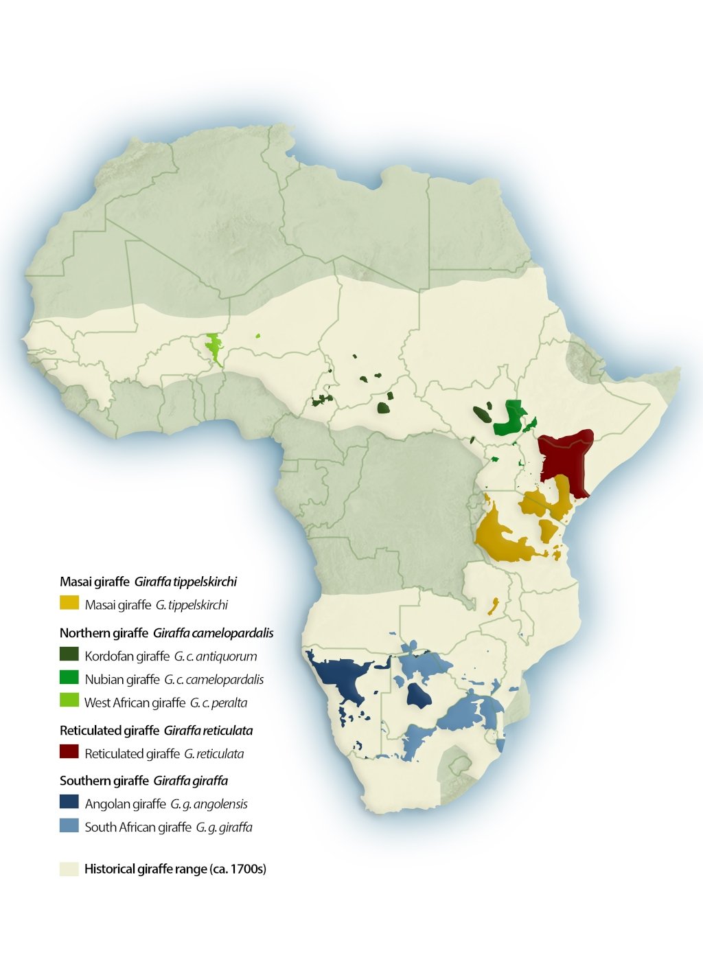 Due to a long-term study on giraffe DNA, four separate species are now recognized. See the table below to find the population size of each species and subspecies.