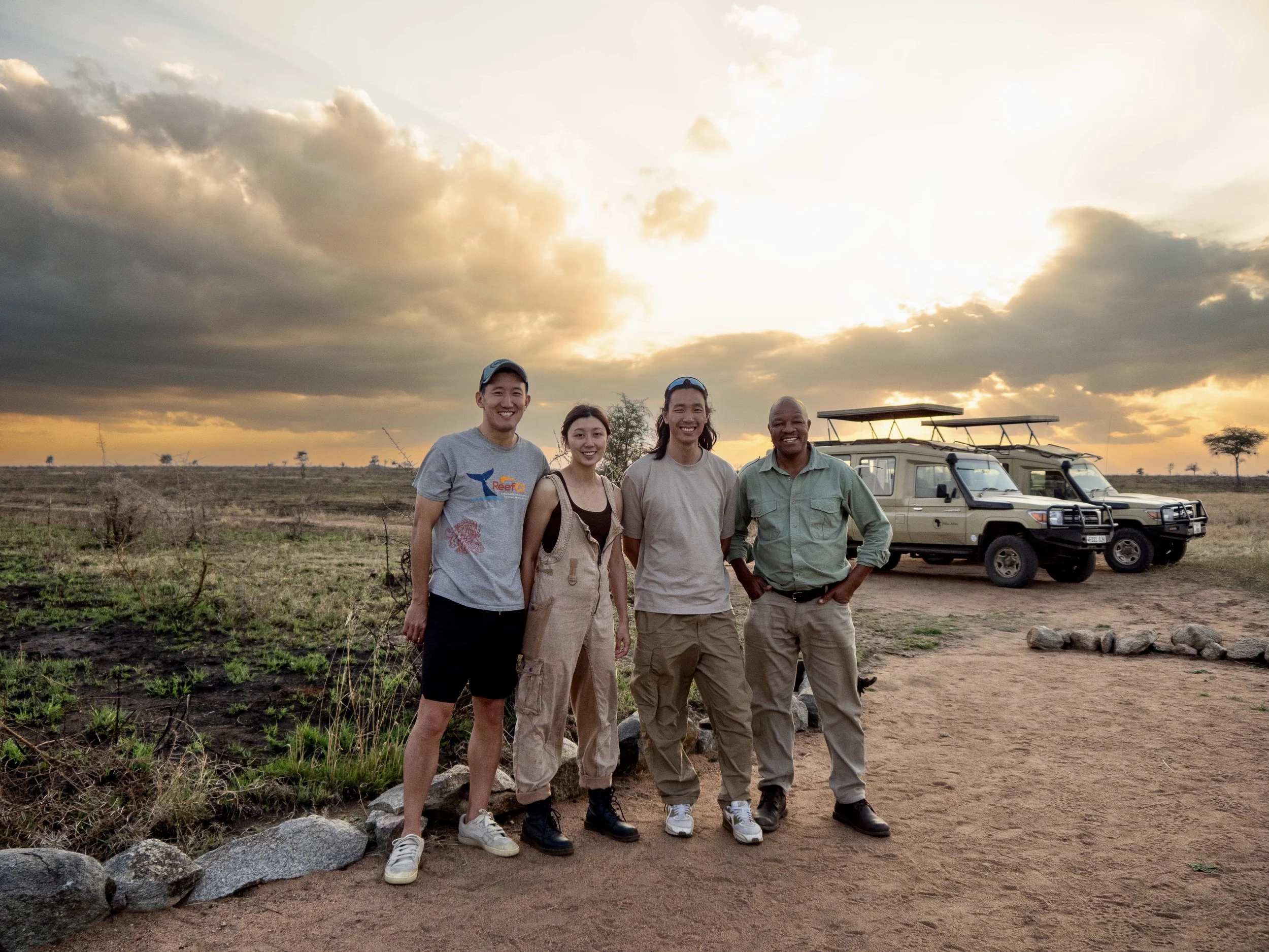Guests and safari guide Halifa Msangi enjoying a golden sunset on the Serengeti plains