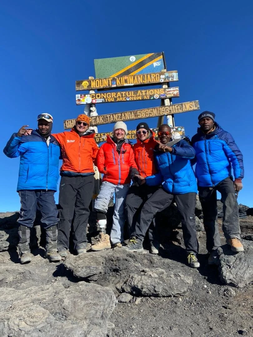 Group of five climbers in colorful jackets at the summit of Mount Kilimanjaro, celebrating their achievement beneath a wooden sign with summit details.